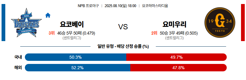 요코하마 대 요미우리 NPB 08월10일 맞대결 생중계, 스포츠중계, 스포츠분석
