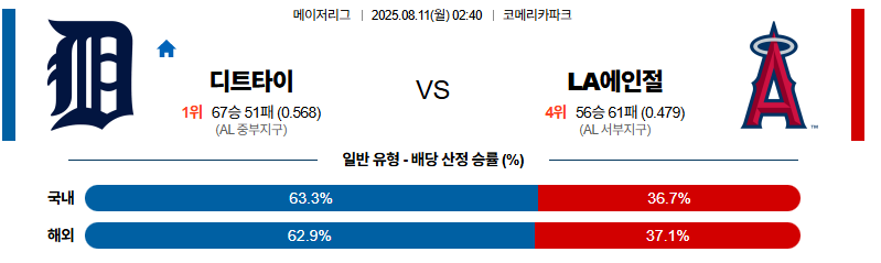 디트로이트 대 LA에인절스 MLB 08월11일 맞대결 생중계, 스포츠중계, 스포츠분석