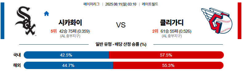 시카고W 대 클리블랜드 MLB 08월11일 맞대결 생중계, 스포츠중계, 스포츠분석