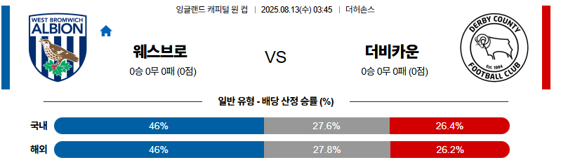 웨스트브로미치 대 더비카운티 잉글랜드FA컵 08월13일 맞대결 생중계, 스포츠중계, 스포츠분석