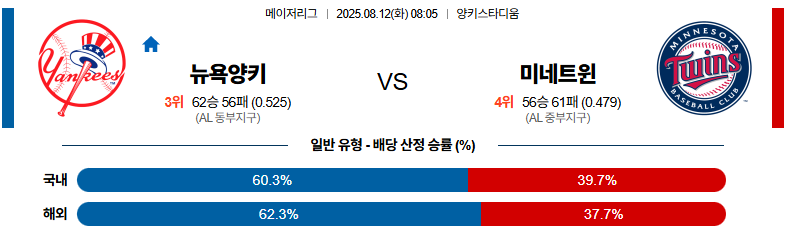 뉴욕양키스 대 미네소타 MLB 08월12일 맞대결 생중계, 스포츠중계, 스포츠분석