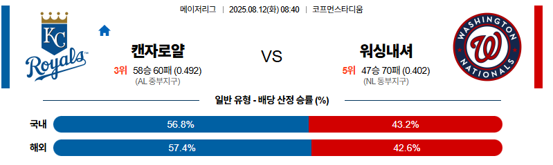 캔자스시티 대 워싱턴 MLB 08월12일 맞대결 생중계, 스포츠중계, 스포츠분석