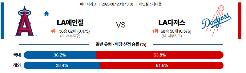 LA에인절스 대 LA다저스 MLB 08월12일 맞대결 생중계, 스포츠중계, 스포츠분석