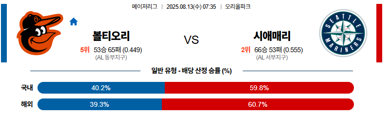 볼티모어 대 시애틀 MLB 08월13일 맞대결 생중계, 스포츠중계, 스포츠분석