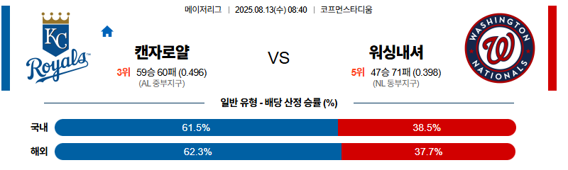 캔자스시티 대 워싱턴 MLB 08월13일 맞대결 생중계, 스포츠중계, 스포츠분석