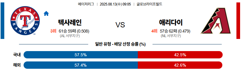 텍사스 대 애리조나 MLB 08월13일 맞대결 생중계, 스포츠중계, 스포츠분석