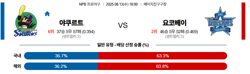야쿠르트 대 요코하마 NPB 08월13일 맞대결 생중계, 스포츠중계, 스포츠분석