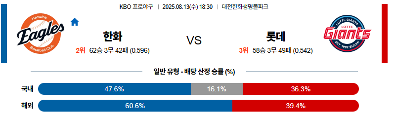 한화 대 롯데 KBO 08월13일 맞대결 생중계, 스포츠중계, 스포츠분석