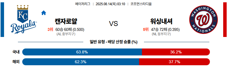 캔자스시티 대 워싱턴 MLB 08월14일 맞대결 생중계, 스포츠중계, 스포츠분석