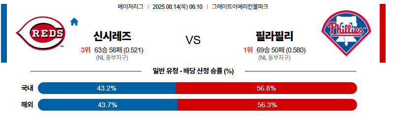 신시내티 대 필라델피아 MLB 08월14일 맞대결 생중계, 스포츠중계, 스포츠분석