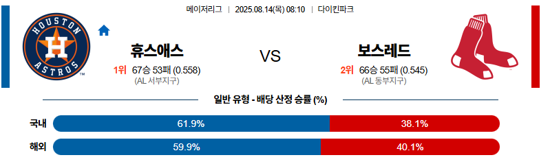 휴스턴 대 보스턴 MLB 08월14일 맞대결 생중계, 스포츠중계, 스포츠분석