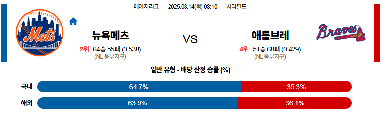 뉴욕메츠 대 애틀랜타 MLB 08월14일 맞대결 생중계, 스포츠중계, 스포츠분석