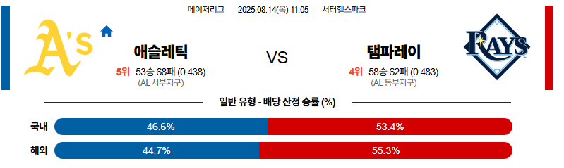 애슬레틱스 대 탬파베이 MLB 08월14일 맞대결 생중계, 스포츠중계, 스포츠분석
