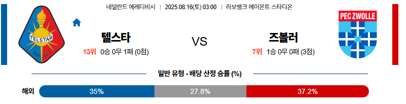 텔스타 대 즈볼레 에레디비지 08월16일 맞대결 생중계, 스포츠중계, 스포츠분석