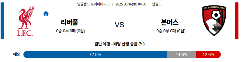 리버풀 대 본머스 프리미어리그 08월16일 맞대결 생중계, 스포츠중계, 스포츠분석