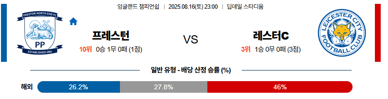 프레스턴 대 레스터시티 잉글랜드챔피언쉽 08월16일 맞대결 생중계, 스포츠중계, 스포츠분석