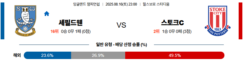 셰필드웬즈데이 대 스토크시티 잉글랜드챔피언쉽 08월16일 맞대결 생중계, 스포츠중계, 스포츠분석