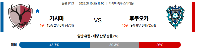 가시마 대 후쿠오카 J리그1 08월16일 맞대결 생중계, 스포츠중계, 스포츠분석