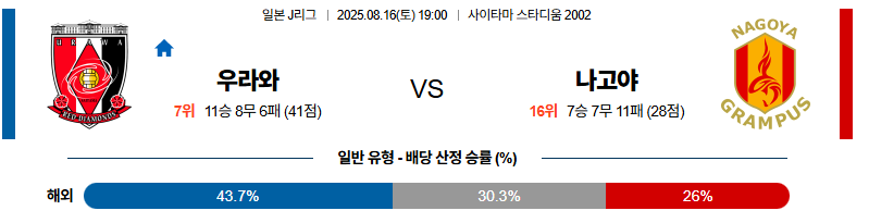 우라와는 홈에서 압박 강도를 유지하며 상대를 몰아붙이는 흐름이 확실합니다. 나고야의 느린 전개와 압박 대응 약점은 우라와가 공략할 최적의 포인트입니다. 전술, 흐름, 심리 모든 면에서 우라와가 유리한 승부로 보입니다.