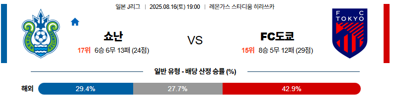 쇼난 대 FC도쿄 J리그1 08월16일 맞대결 생중계, 스포츠중계, 스포츠분석