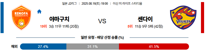 야마구치 대 베갈타센다이 J리그2 08월16일 맞대결 생중계, 스포츠중계, 스포츠분석