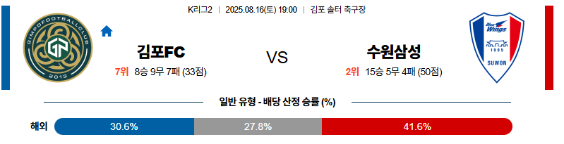 김포FC는 루이스를 축으로 한 역습 완성도가 돋보이며, 활동량과 압박 강도에서 수원을 압도할 가능성이 높습니다. 수원은 주전 부재와 체력 소모 부담 속에 김포의 속도와 전환에 대응하기 쉽지 않을 것입니다. 전술적 안정성과 심리적 우위 모두 김포가 앞서 있는 만큼, 홈에서 확실히 승부를 가져갈 것으로 예상됩니다.