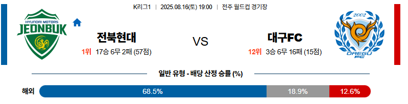 전북현대모터스 대 대구FC K리그1 08월16일 맞대결 생중계, 스포츠중계, 스포츠분석