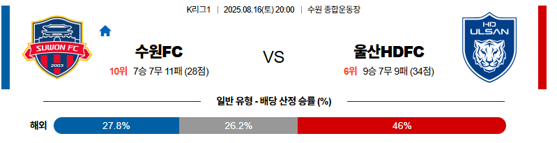 수원FC 대 울산 K리그1 08월16일 맞대결 생중계, 스포츠중계, 스포츠분석