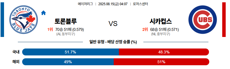 토론토 대 시카고컵스 MLB 08월15일 맞대결 생중계, 스포츠중계, 스포츠분석