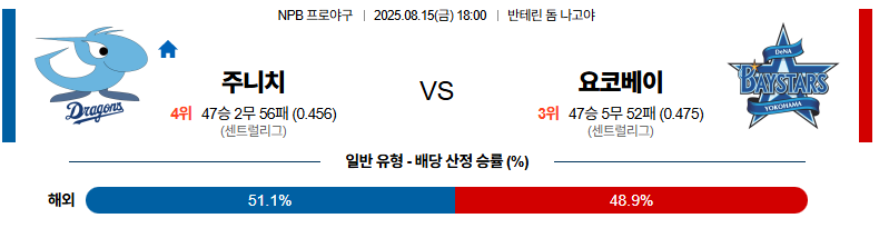 주니치 대 요코하마 NPB 08월15일 맞대결 생중계, 스포츠중계, 스포츠분석