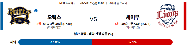 오릭스 대 세이부 NPB 08월15일 맞대결 생중계, 스포츠중계, 스포츠분석
