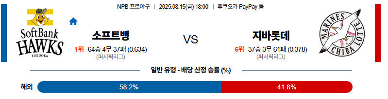 소프트뱅크 대 지바롯데 NPB 08월15일 맞대결 생중계, 스포츠중계, 스포츠분석