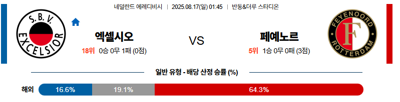엑셀시오르 대 폐예노르트 에레디비지 08월17일 맞대결 생중계, 스포츠중계, 스포츠분석