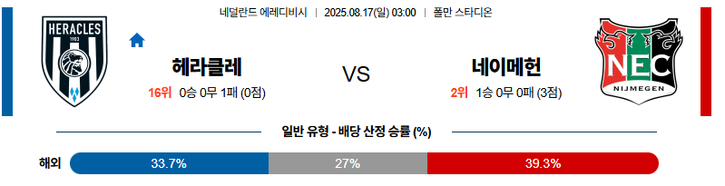 헤라클레스 대 네이메헌 에레디비지 08월17일 맞대결 생중계, 스포츠중계, 스포츠분석
