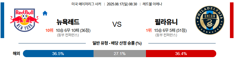 원정팀인 필라델피아는 안정적인 라인 유지와 압박 전환 속도로 경기 후반까지 흐름을 이어갈 수 있습니다. 반면 뉴욕레드불은 체력 저하 구간에서 전개 속도와 간격 관리가 동시에 무너질 위험이 높습니다. 따라서 필라델피아가 승점 3점을 가져갈 가능성이 높습니다.