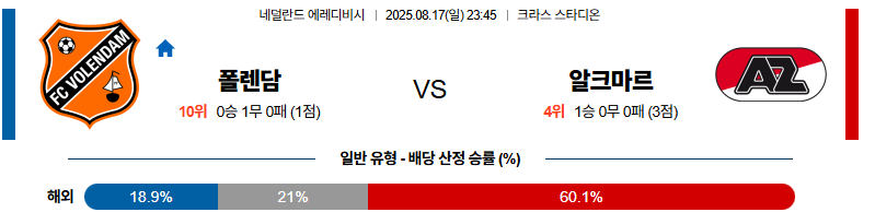 폴렌담 대 알크마르 에레디비지 08월17일 맞대결 생중계, 스포츠중계, 스포츠분석