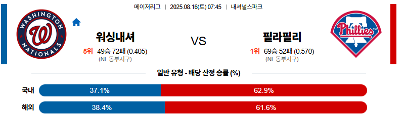 워싱턴 대 필라델피아 MLB 08월16일 맞대결 생중계, 스포츠중계, 스포츠분석