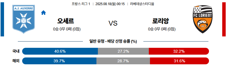 오세르 대 로리랑 리그앙 08월18일 맞대결 생중계, 스포츠중계, 스포츠분석