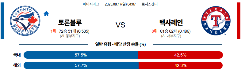 토론토 대 텍사스 MLB 08월17일 맞대결 생중계, 스포츠중계, 스포츠분석