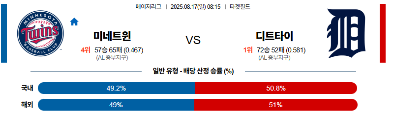 미네소타 대 디트로이트 MLB 08월17일 맞대결 생중계, 스포츠중계, 스포츠분석