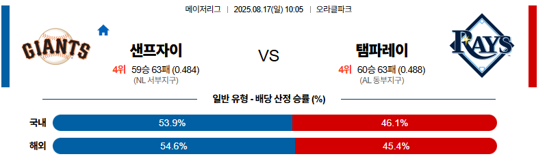 샌프란시스코 대 탬파베이 MLB 08월17일 맞대결 생중계, 스포츠중계, 스포츠분석