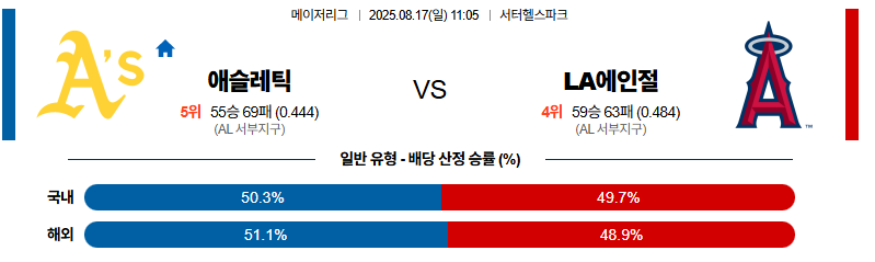 애슬레틱스 승리, 핸디는 LA 에인절스 승리, 언더 오버는 오버로 추천드립니다.