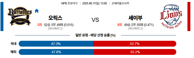 오릭스 대 세이부 NPB 08월17일 맞대결 생중계, 스포츠중계, 스포츠분석