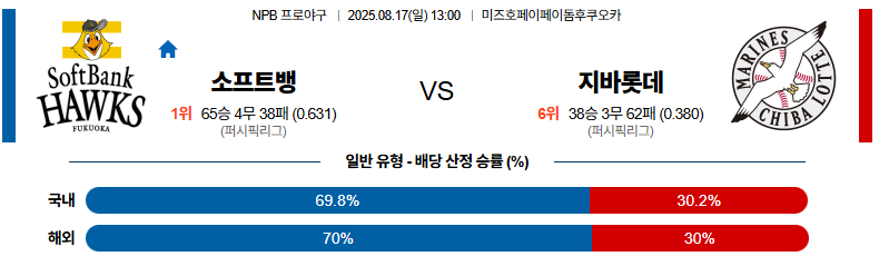 소프트뱅크 대 지바롯데 NPB 08월17일 맞대결 생중계, 스포츠중계, 스포츠분석