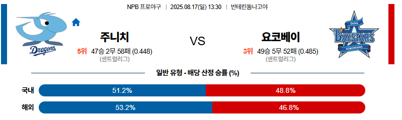 주니치 대 요코하마 NPB 08월17일 맞대결 생중계, 스포츠중계, 스포츠분석