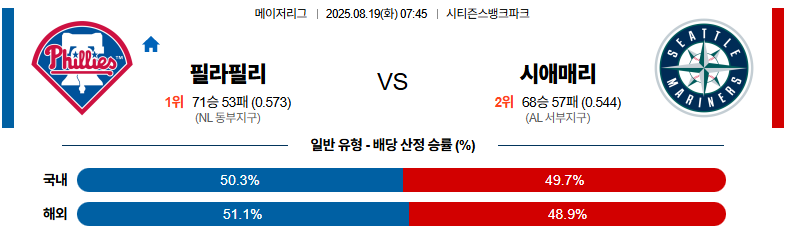 필라델피아 대 시애틀 MLB 08월19일 맞대결 생중계, 스포츠중계, 스포츠분석