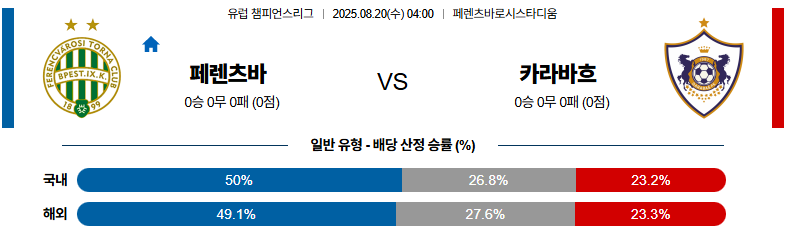 페렌츠바로스 대 카라바흐 UEFA챔피언스리그 08월20일 맞대결 생중계, 스포츠중계, 스포츠분석