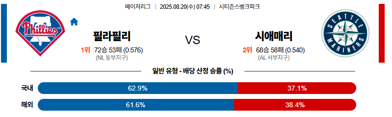 필라델피아 대 시애틀 MLB 08월20일 맞대결 생중계, 스포츠중계, 스포츠분석