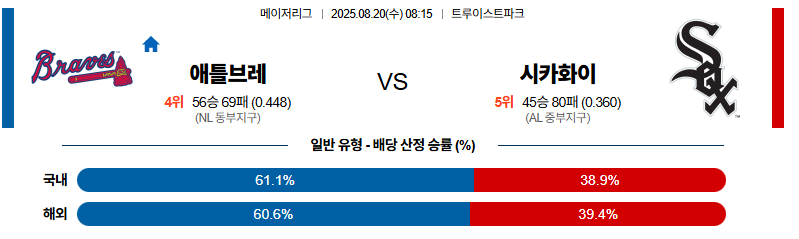 애틀랜타 대 시카고W MLB 08월20일 맞대결 생중계, 스포츠중계, 스포츠분석