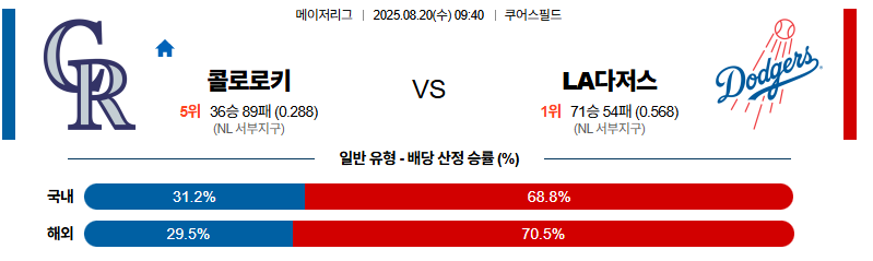 콜로라도 대 LA다저스 MLB 08월20일 맞대결 생중계, 스포츠중계, 스포츠분석